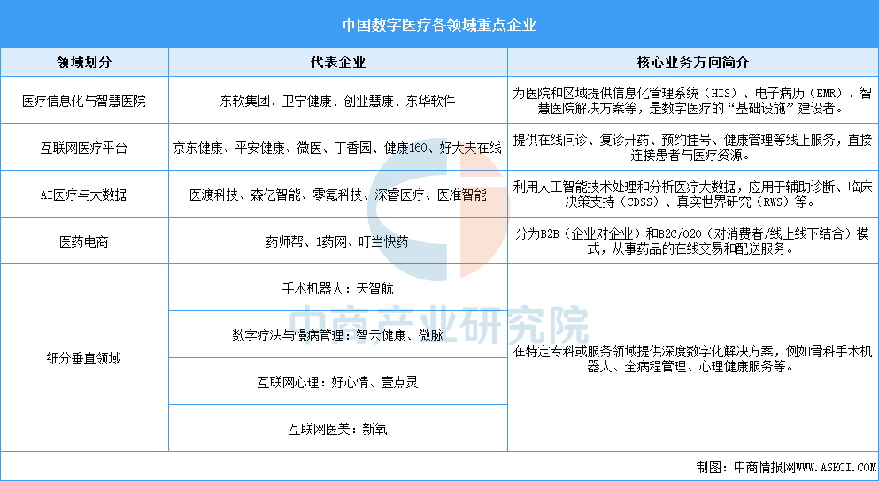中国数字医疗各领域涌现出众多优秀企业,它们在不同细分市场中发挥着重要作用。以下是一些主要的数字医疗企业及其业务领域: