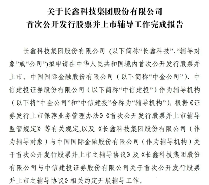 据证监会官网披露,长鑫科技已发布IPO辅导工作完成报告。