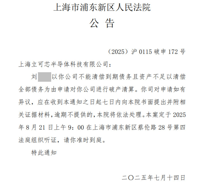 今年7月14日,上海市浦东新区人民法院发布了“(2025)沪0115破申172号”信息,刘某某以债务人上海立可芯半导体科技有限公司不能清偿到期债务且资产不足以偿清全部债务为由,向法院申请对该公司进行破产清算。法院已受理此项申请,并明确要求上海立可芯半导体科技有限公司若对申请存有异议,需在收到通知之日起七日内向法院书面提交并附上相关证据材料,逾期未提供将依法处理。同时,法院告知本案将于2025年8月21日上午9:00,在上海市浦东新区蔡伦路28号第四法庭组织听证,提醒该公司准时到庭。