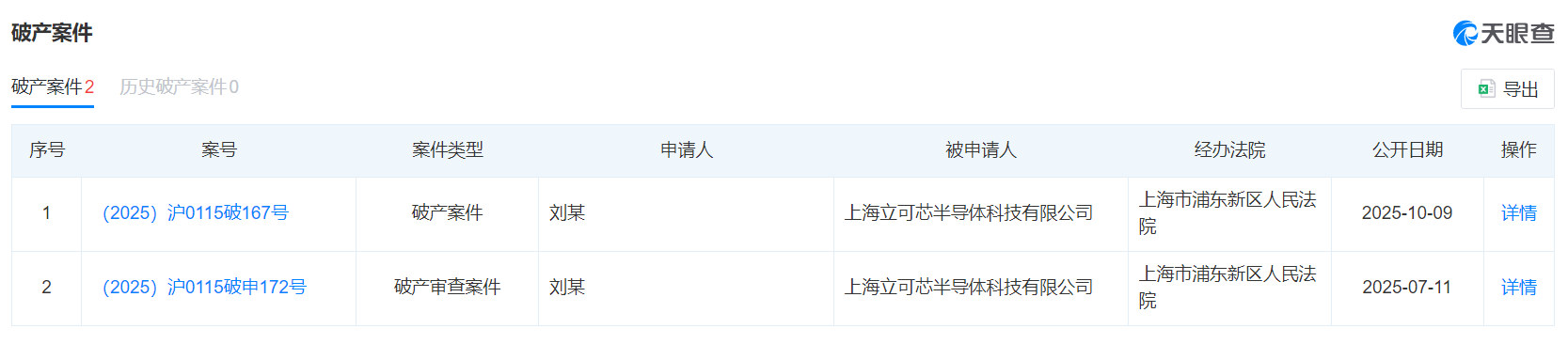 2025年10月9日,全国企业破产重整案件信息网公布了一则案件信息,涉及集成电路企业上海立可芯半导体科技有限公司,案件编号为“(2025)沪0115破167号”,案件由上海市浦东新区人民法院受理,被申请人上海立可芯半导体科技有限公司正面临着破产风险。天眼查显示,上海立可芯半导体科技有限公司目前为“已歇业”状态。