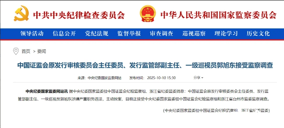 (文/罗叶馨梅)10月10日,据中央纪委国家监委网站消息,中国证监会原发行审核委员会主任委员、发行监管部副主任、一级巡视员郭旭东涉嫌严重职务违法,主动投案,目前正接受中央纪委国家监委驻中国证监会纪检监察组和浙江省台州市监委监察调查。