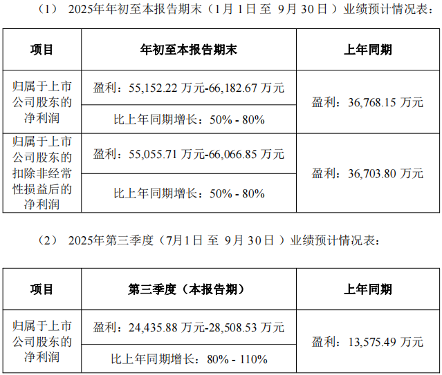 2025年第三季度(7月1日至9月30日)单独来看,归属于上市公司股东的净利润预计盈利24,435.88万元至28,508.53万元,比上年同期的13,575.49万元增长80%至110%;归属于上市公司股东的扣除非经常性损益后的净利润预计盈利24,417.27万元至28,486.82万元,比上年同期的13,565.15万元增长80%至110%。