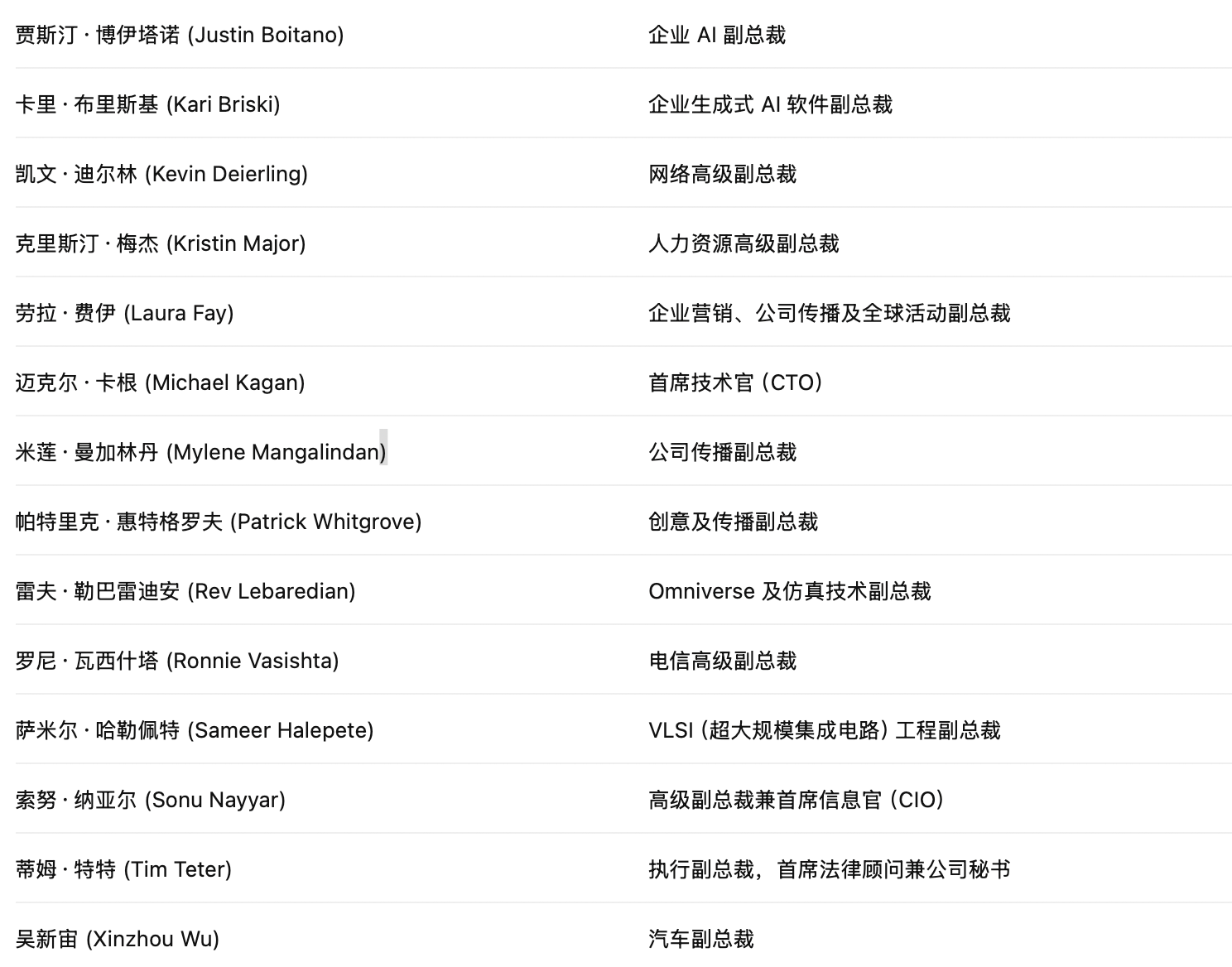 以下是《商业内幕》获得的黄仁勋直接下属名单,包括各关键部门的高级副总裁和执行副总裁: