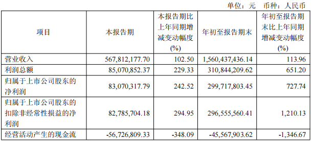 从年初至报告期末(2025年1-9月),公司业绩增长更为强劲:营业收入达15.6亿元,同比增幅113.96%;归属于上市公司股东的净利润2.997亿元,同比激增727.74%;归属于上市公司股东的扣除非经常性损益的净利润2.966亿元,同比增幅高达1210.13%;基本每股收益0.6631元/股,同比增长727.84%,加权平均净资产收益率22.34%,较上年同期增加19.19个百分点。
