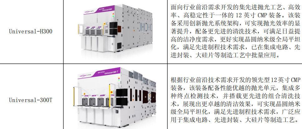 其中,CMP装备拥有Universal-H300、Universal-300T、Universal-300X等多款型号,全新抛光系统架构CMP机台Universal-H300已获批量重复订单,实现规模化出货;新签 CMP装备订单中先进制程的订单已实现较大占比,部分先进制程CMP装备在国内多家头部客户实现全部工艺验证。12英寸及8英寸等CMP装备在国内客户端占据较高市场。