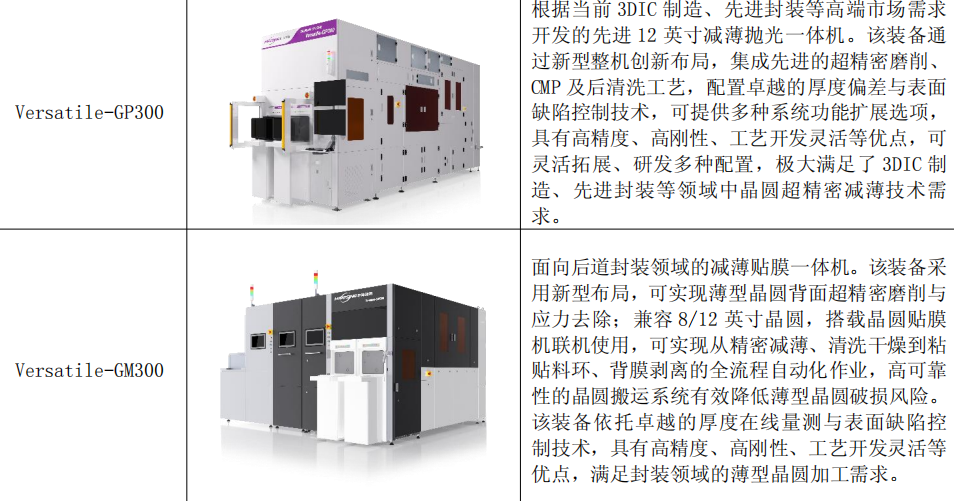 此外,随着先进封装和化合物半导体市场前景明朗,减薄装备和划切装备的需求正逐步拉升。因应市场变化,基于自身对CMP装备领域的深耕和技术积累,华海清科开发出适用于先进封装领域和前道晶圆制造背面减薄工艺的减薄装备。报告期内,12英寸超精密晶圆减薄机Versatile–GP300凭借优异性能,订单量大幅增长;12英寸晶圆减薄贴膜一体机 Versatile–GM300兼容Wafer to Wafer(W2W)和 Die to Wafer(D2W)两种主流先进封装工艺路线,报告期实现批量发货,连续发往国内多家半导体龙头企业。
