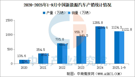 2025年9月中国新能源汽车产销情况:出口同比增长1倍(图)