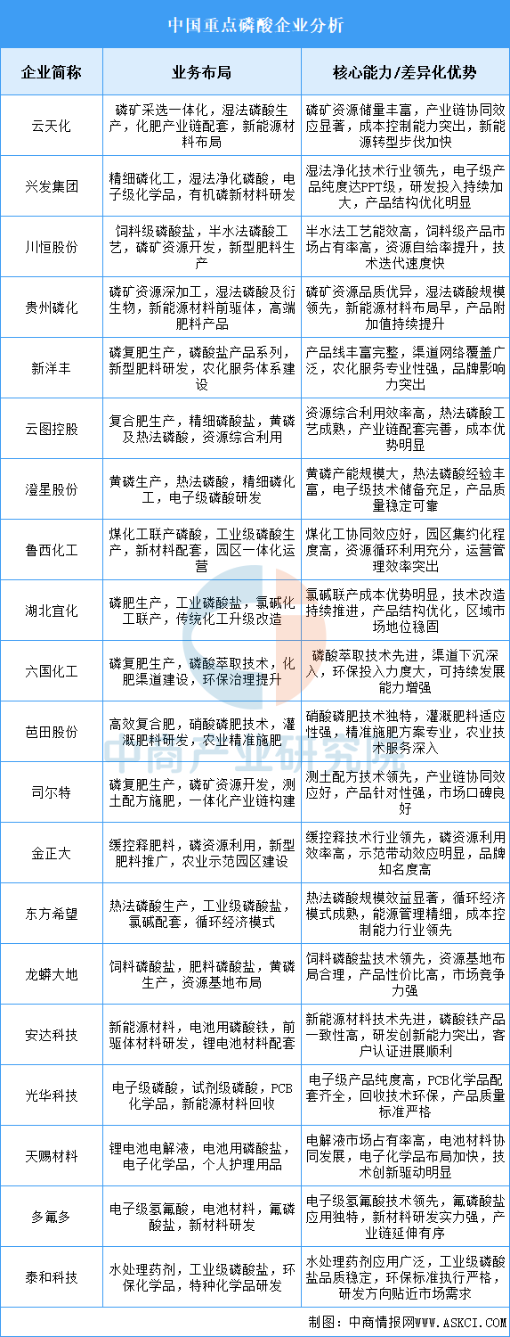 中商情报网讯:行业正经历从传统工业级向电子级、食品级等高纯度产品转型升级,技术竞争聚焦湿法净化、热法工艺优化及新能源材料配套能力,下游应用从化肥领域向锂电池正极材料、电子化学品等高附加值领域快速拓展。云天化以磷矿资源一体化优势主导市场;兴发集团借湿法净化技术突破电子级领域;川恒股份依托半水法工艺创新巩固饲料级市场。