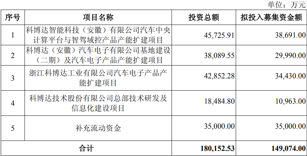 10月23日,科博达技术股份有限公司(证券代码:603786,证券简称:科博达)发布向不特定对象发行可转换公司债券预案,计划募集资金总额不超过149,074万元,用于产能扩建、技术研发及补充流动资金等多个项目,助力公司在汽车电子领域的持续发展。
