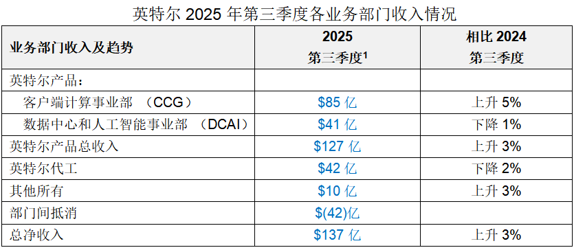 从业务部门收入情况来看,客户端计算事业部 (CCG)实现营收85亿美元,相比2024第三季度增长5%。英特尔代工也实现了42亿美元营收。