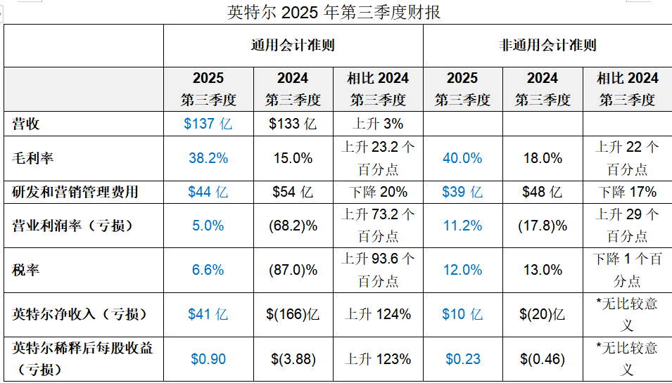 10月24日,英特尔发布2025年第三季度财报,营收137亿美元,同比增长3%,净利润41亿美元,扭转亏损局面,每股收益(EPS)为0.90美元;非通用会计准则(Non-GAAP)每股收益为0.23美元。