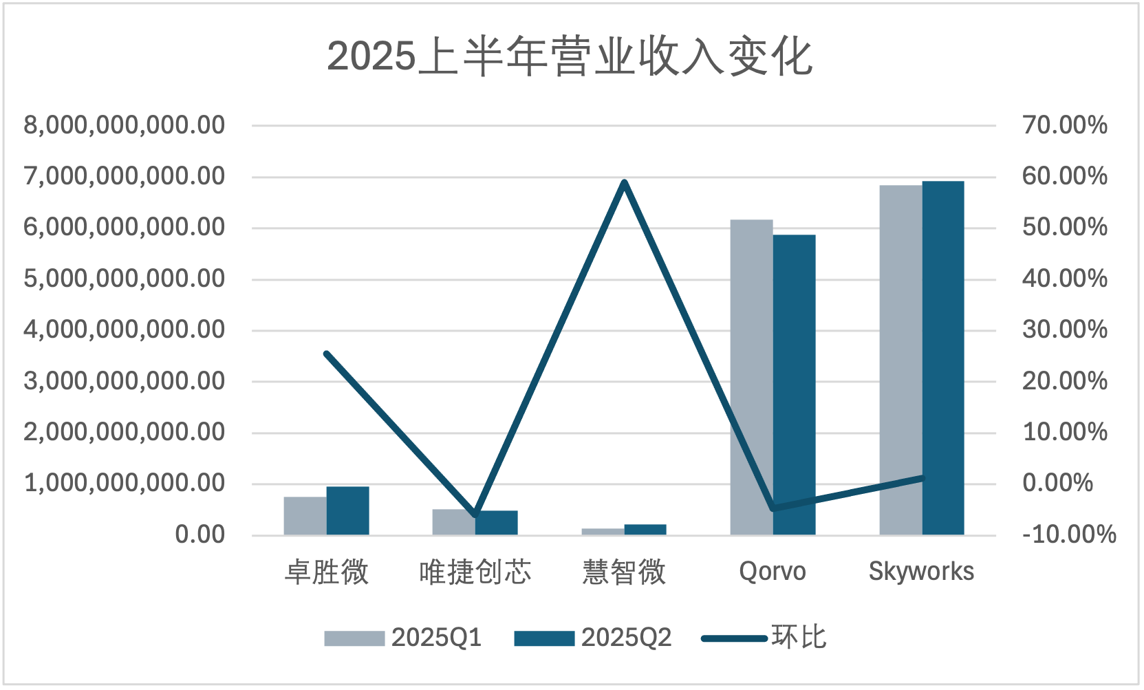 从财务数据看,国内厂商的营收增长势头强劲。卓胜微第二季度营收环比增长为25.43%,慧智微更是高达环比增长59%,表明市场接受度正在提升。
