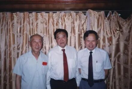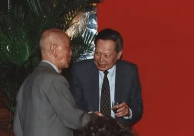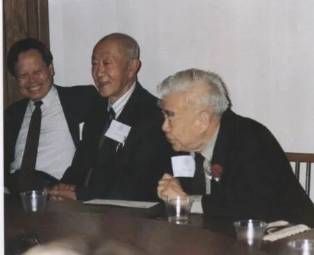 1992年6月1日,北京大学在勺园餐厅举行周培源先生九十大寿庆祝晚宴。晚宴前,当年西南联大时期的三剑客:杨振宁(右)、张守廉(中)和黄昆(左)三位老友重逢一起,留下了一张珍贵的合影