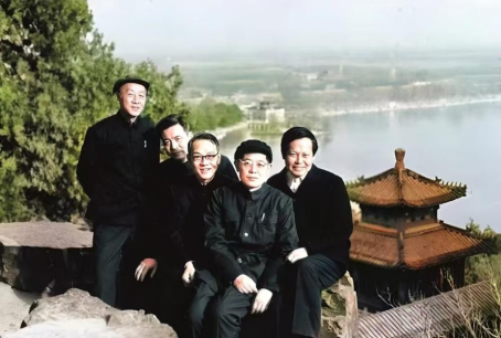 1974年,黄昆、邓稼先、黄宛、周光召、杨振宁(由左至右)游览北京颐和园时的合影
