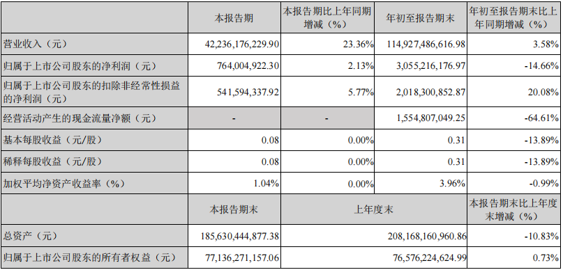 从年初至报告期末(2025年1-9月)来看,公司累计实现营业收入114,927,486,616.98元,同比增长3.58%;归属于上市公司股东的净利润3,055,216,176.97元,同比下降14.66%;归属于上市公司股东的扣除非经常性损益的净利润2,018,300,852.87元,同比大幅增长20.08%;经营活动产生的现金流量净额1,554,807,049.25元,同比下降64.61%;基本每股收益与稀释每股收益均为0.31元/股,同比下降13.89%;加权平均净资产收益率3.96%,较上年同期下降0.99个百分点。