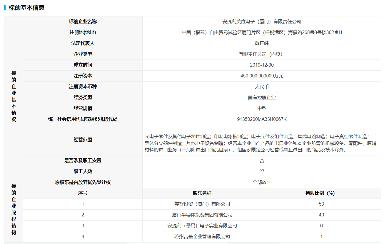 本次股权转让由安捷利美维的三大国有股东同步推进。其中,美智投资(厦门)有限公司(持股53%)拟转让12.41%股权;厦门半导体投资集团有限公司(持股40%)拟转让27.59%股权;安捷利(番禺)电子实业有限公司(持股6%)拟全额转让所持6%股权。