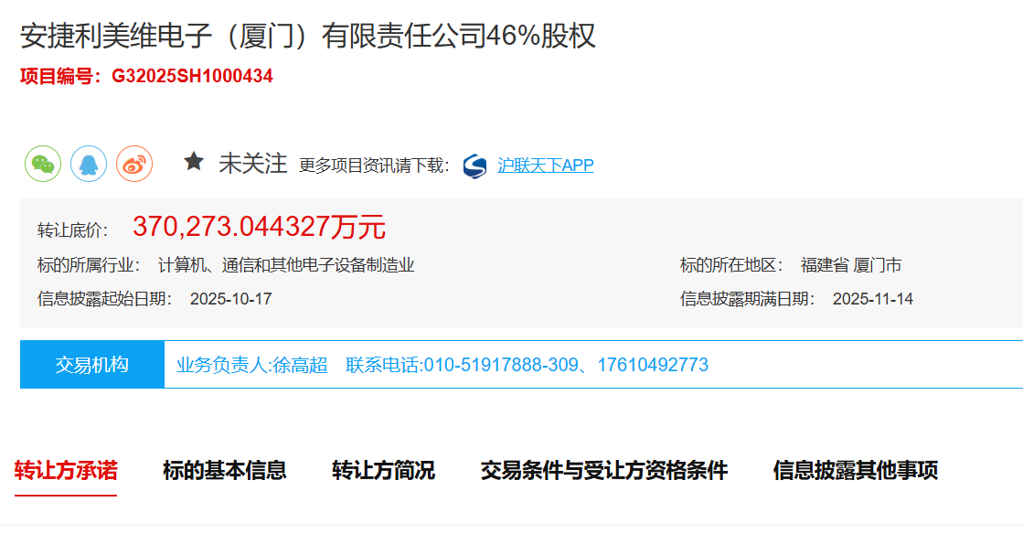 近日,安捷利美维电子(厦门)有限责任公司(以下简称“安捷利美维”)46%股权正式于产权交易平台挂牌转让,转让底价约37.03亿元。此次重大股权变动由多家具有国有背景的股东联合发起,被视为国资在高端电子制造领域进行战略性资源整合的关键举措,引发行业高度关注。