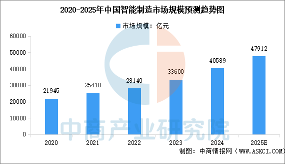 智能制造是一种先进的生产模式,将工业机器人、人工智能、物联网、大数据等自动化及数字化技术与制造系统融为一体。数字技术日益普及,政府举措促进产业升级,高质量制造产出的需求日益高涨,推动中国智能制造市场规模从2020年的21945亿元增至2024年的40589亿元,复合年增长率为16.6%。中商产业研究院分析师预测,2025年中国智能制造市场规模将达到47912亿元。