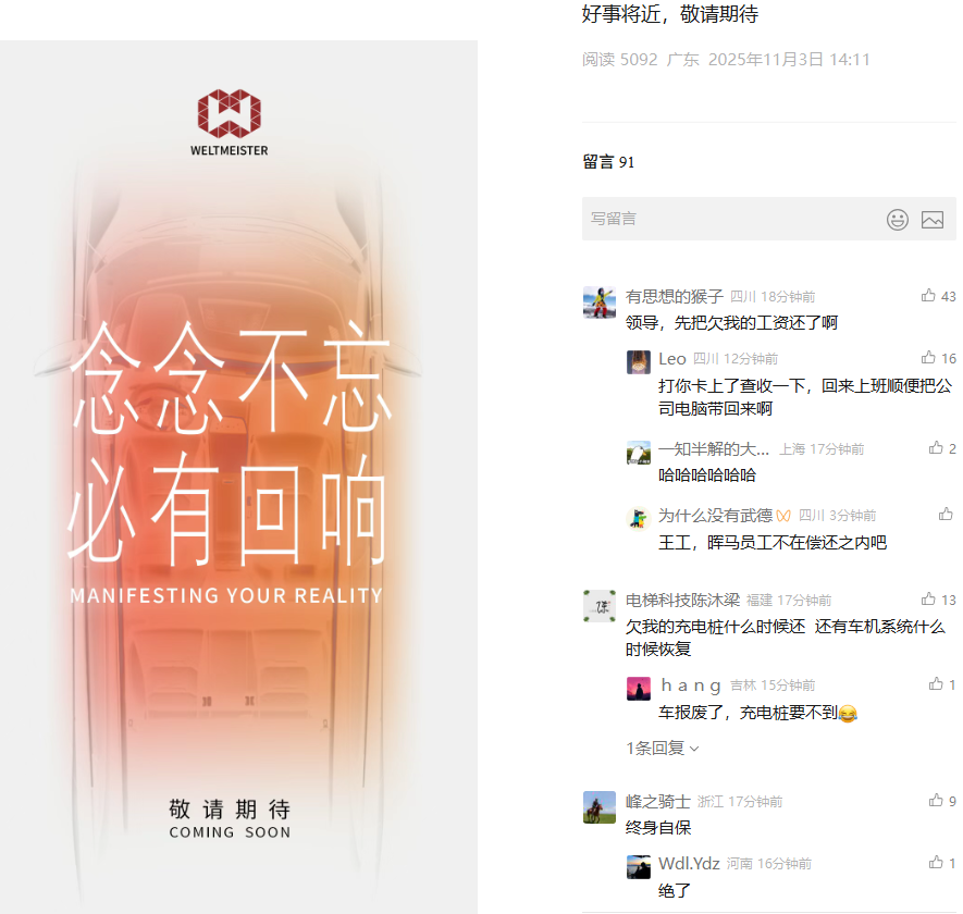 威马汽车官宣“好事”将近,留言要求补发欠薪