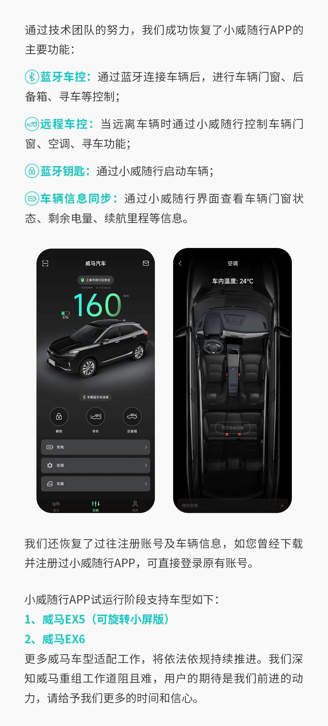 威马汽车“小威随行”APP重新上线 远程车控、蓝牙钥匙等功能恢复