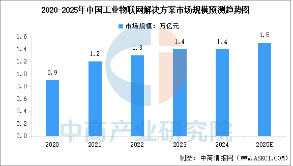 政策支持以及5G云计算等基础技术的日趋成熟,为工业物联网市场的持续增长奠定了坚实基础。中商产业研究院发布的《2025-2030年中国工业物联网行业深度分析及发展趋势预测研究报告》显示,中国工业物联网解决方案市场规模由2020年的0.9万亿元增长至2024年的1.4万亿元。中商产业研究院分析师预测,2025年中国工业物联网解决方案市场规模将达到1.5万亿元。