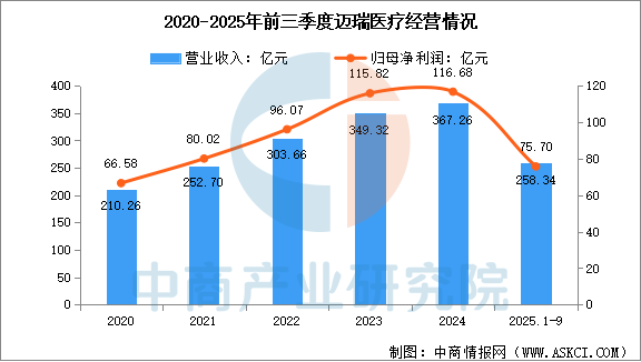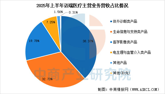 2025年前三季度,迈瑞医疗营业收入为258.34亿元,同比下降12.38%,归母净利润为75.70亿元,同比下降28.83%。上半年,公司体外诊断类产品收入64.24亿元,占比38.37%,生命信息与支持类产品收入54.79亿元,占比32.73%,医学影像类产品收入33.12亿元,占比19.78%,电生理与血管介入类产品收入12.14亿元,占比7.25%。