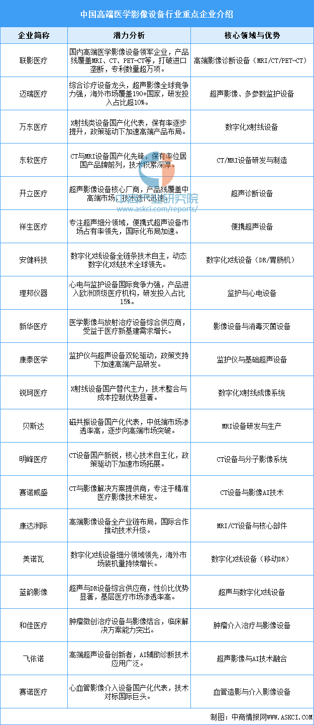 中国高端医学影像设备行业呈现多元化竞争格局,国产企业在政策支持与技术突破下逐步打破进口垄断。头部企业通过高研发投入、全球化布局及临床需求导向的创新,在MRI、CT、超声等核心领域形成差异化优势。未来随着AI融合与产业链升级,行业将加速向智能化、精准化发展,具备全链条技术能力的企业有望在国际市场占据更大份额。