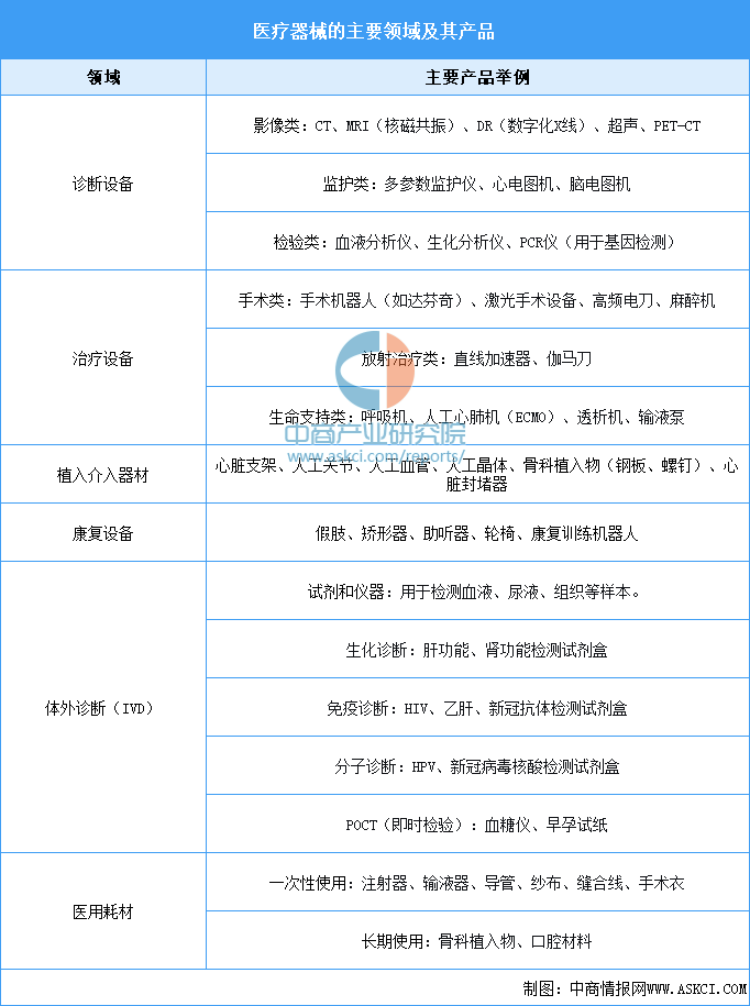 根据中国国家药品监督管理局的定义,医疗器械是指直接或者间接用于人体的仪器、设备、器具、体外诊断试剂及校准物、材料以及其他类似或者相关的物品,包括所需要的计算机软件。按照具体用途,医疗器械主要包括诊断设备、治疗设备、植入介入器材、康复设备、体外诊断(IVD)、医用耗材等。