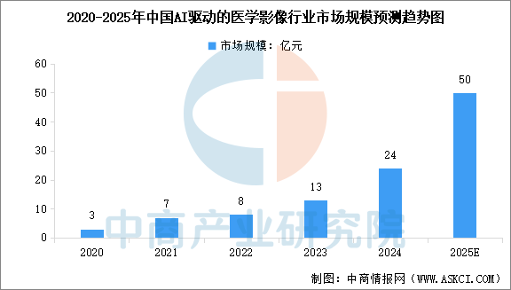 AI医学影像已成为医疗健康行业中发展最快的细分领域之一,中国由AI驱动的医学影像市场持续扩大。中商产业研究院发布的《2025-2030年中国医疗器械行业调查及发展前景研究报告》显示,中国AI驱动的医学影像市场规模由2020年的3亿元增加至2024年的24亿元。中商产业研究院分析师预测,2025年中国AI驱动的医学影像市场规模将达到50亿元。