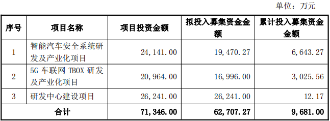 截至2025年10月31日,公司三大募投项目的资金使用情况如下:智能汽车安全系统研发及产业化项目拟投入募集资金19470.27万元,累计投入6643.27万元;5G车联网TBOX研发及产业化项目拟投入募集资金16996万元,累计投入3025.56万元;研发中心建设项目拟投入募集资金26241万元,累计投入12.17万元,三大项目合计拟投入募集资金62707.27万元,累计投入9681万元。募集资金存放方面,截至同期,公司募集资金在三家银行专户的余额合计19916万元,另有募集资金现金管理总额34000万元,理财收益及利息收入净额为889.73万元。