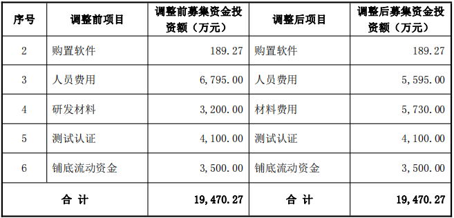 在5G车联网TBOX研发及产业化项目(拟投入募集资金16996万元)中,购置设备投资额从3126万元调整至461万元,购置软件从1670万元调整至585万元,人员费用从6000万元调整至5200万元,研发材料(调整后统称“材料费用”)从1200万元增至5750万元;测试认证、铺底流动资金投资额维持2500万元不变。
