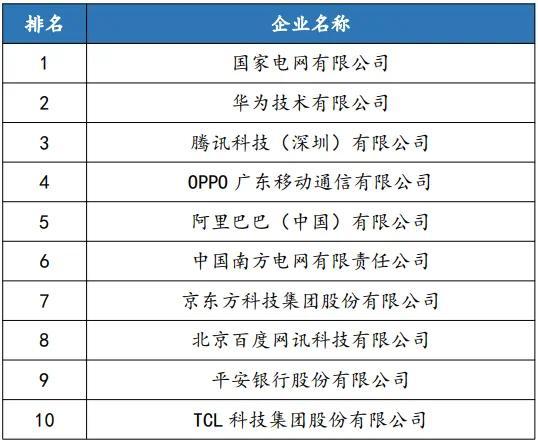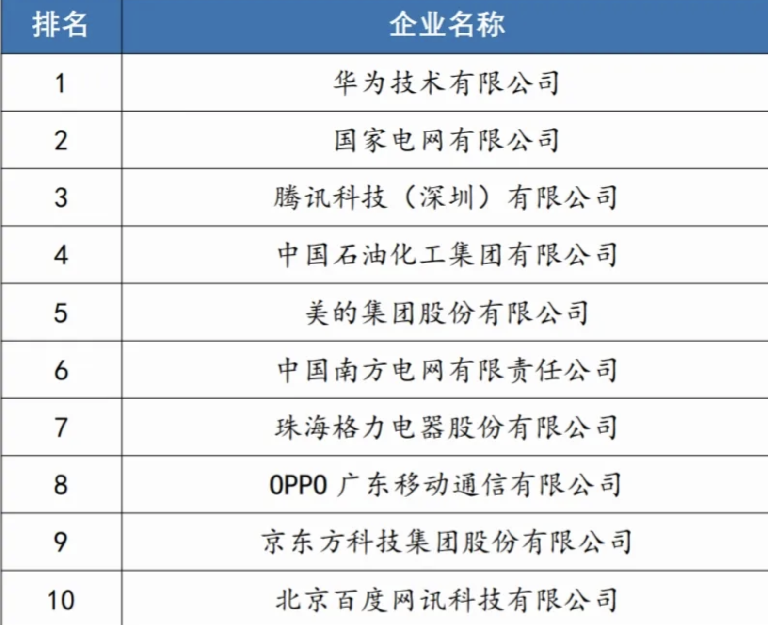在中国企业专利创新百强榜TOP10榜单中,华为、国家电网、腾讯、中国石油、美的、南方电网、格力、OPPO、京东方和百度分列其中。
