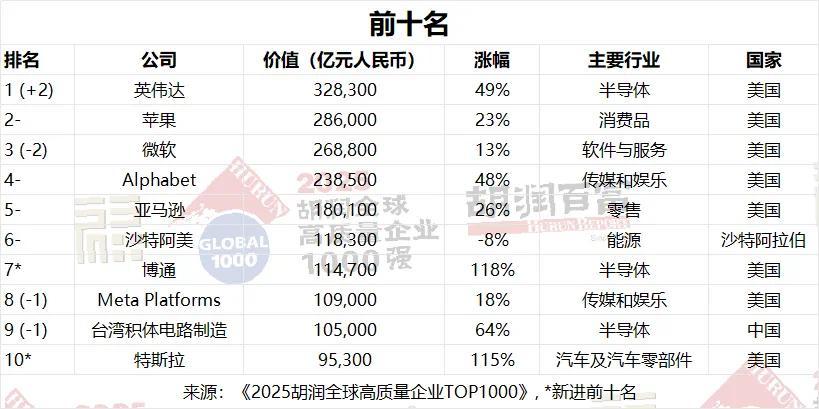 博通和特斯拉跻身前十。博通上升四位至第七位,价值上升118%至11.5万亿元人民币;特斯拉上升三位至第十位,价值上升115%至9.5万亿元人民币。