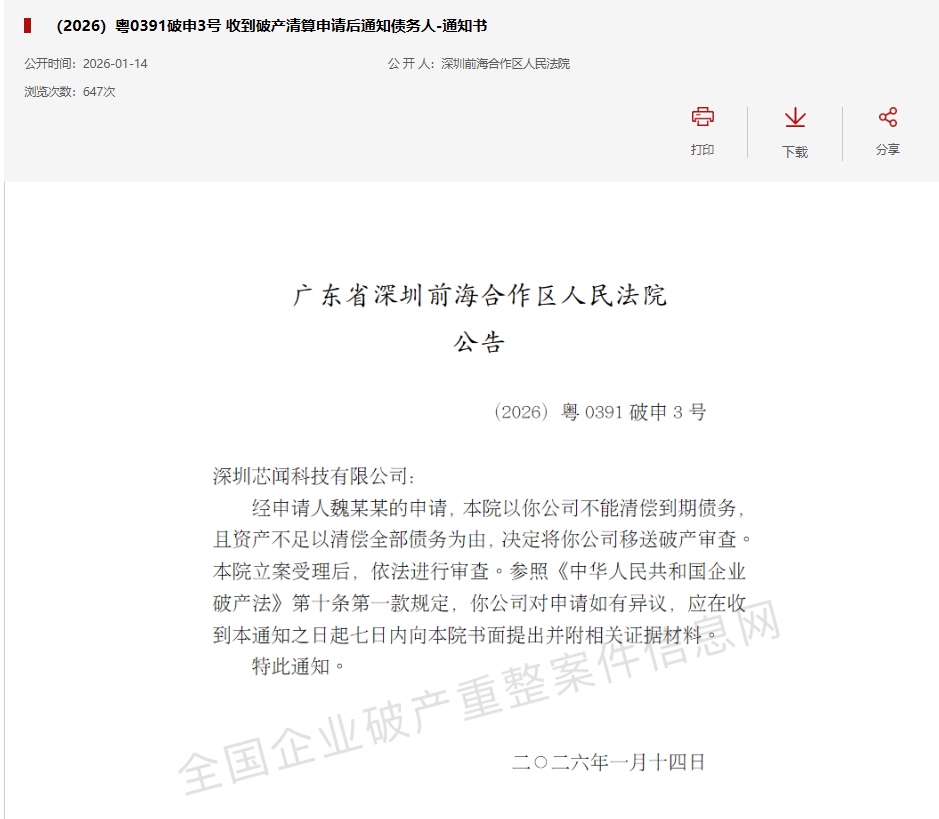 据全国企业破产重整案件信息网公开信息显示,1月14日,新增深圳芯闻科技有限公司破产审查案件,此次破产审查申请案号为(2026)粤0391破申3号。