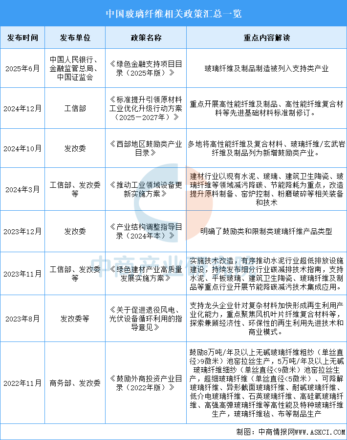 中商情报网讯:国家陆续出台了多项政策,鼓励玻璃纤维行业发展与创新,《标准提升引领原材料工业优化升级行动方案(2025—2027年)》《西部地区鼓励类产业目录》《推动工业领域设备更新实施方案》等产业政策为玻璃纤维行业的发展提供了明确、广阔的市场前景,为企业提供了良好的生产经营环境。具体情况列示如下: