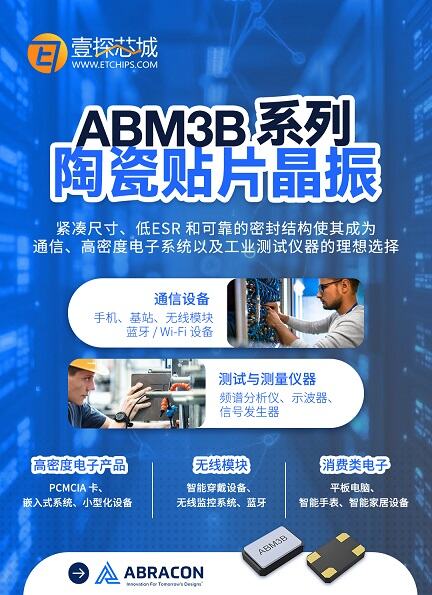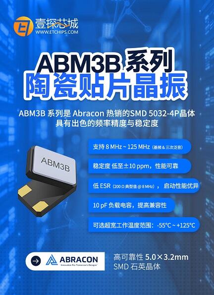 ABM3B 系列是 Abracon 热销的SMD 5032-4P晶体,具有出色的频率精度与稳定度。其紧凑尺寸、低