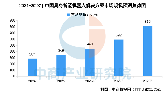 作为具身智能的核心载体,智能机器人赛道呈现快速增长态势。中商产业研究院发布的《2025-2030年中国具身智能机器人深度分析及发展前景研究预测报告》显示,2025年中国具身智能机器人解决方案市场规模达到346亿元,同比增长20.6%。中商产业研究院分析师预测,2026年中国具身智能机器人解决方案市场规模将达到449亿元,2028年市场规模将达到815亿元。