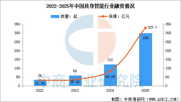 中商产业研究院发布的《2025-2030年中国具身智能机器人深度分析及发展前景研究预测报告》显示,2022至2025年,中国具身智能投融资急剧升温,累计披露金额达480亿元。其中2025年为爆发拐点,单年融资骤增至329亿元,占四年总额近七成,且资金高度集中于头部企业,资本正快速向少数潜力玩家聚集。