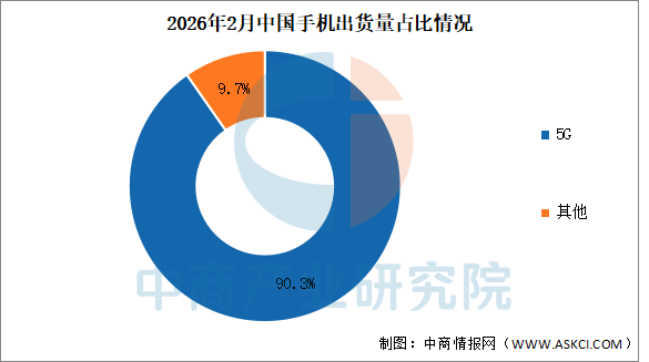 目前市场仍以5G手机为主,2026年1-2月,5G手机出货量3580.1万部,同比下降14.0%,占同期手机出货量的90.3%。