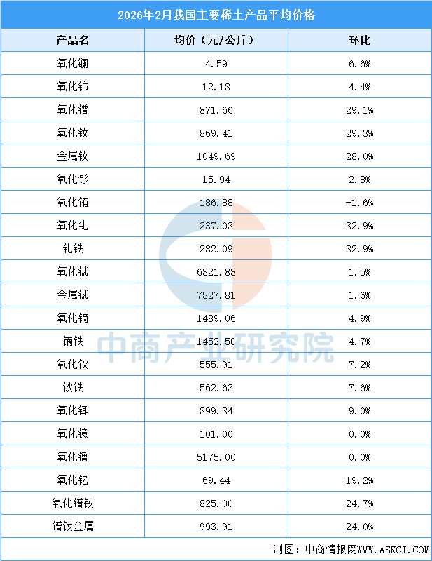 2026年2月我国主要稀土产品平均价格如下: