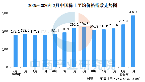 中商情报网讯:2026年2月,稀土价格指数整体呈上行态势。本月平均价格指数为285.4点。价格指数最高为2月27日的307.5点,最低为2月2日的257.6点。高低点相差49.9点,波动幅度约为17.5%。