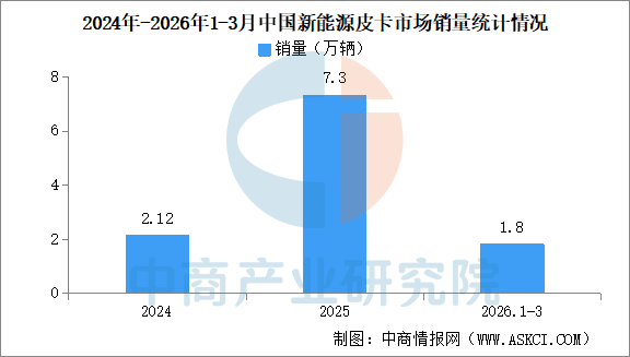 中商情报网讯:2026年3月,全国新能源皮卡0.69万辆,同比下降3%,环比增长26%;2026年1-3月,全国新能源皮卡1.8万辆,同比增长2%。