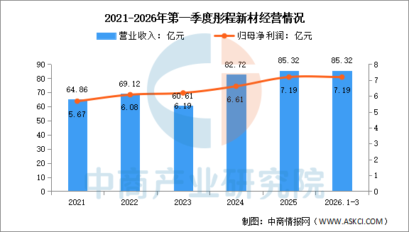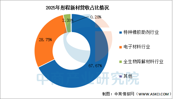 2026年第一季度实现营业收入10.49亿元,同比增长22.55%;实现归母净利润1.82亿元,同比增长13.75%。2025年主营产品包括特种橡胶助剂行业、电子材料行业、全生物降解材料行业,营收分别占整体的67.67%、28.75%、3.30%。