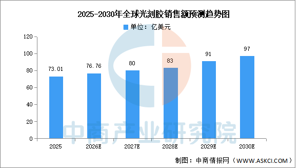 光刻胶是微细加工技术的关键性材料,通过光化学反应将微细图形从掩模版转移至待加工基片。中商产业研究院发布的《2026-2031全球及中国光刻胶和光刻胶辅助材料行业发展现状调研及投资前景分析报告》显示,2025年全球光刻胶市场销售额达73.01亿美元。中商产业研究院分析师预测,2026年我国光刻胶市场规模将达76.76亿美元。