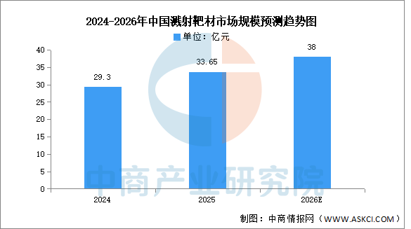 中商产业研究院发布的《2026-2031年中国溅射靶材行业前景与市场趋势洞察专题研究报告》显示,2025年中国溅射靶材市场规模约为33.65亿元。中商产业研究院分析师预测,2026年中国溅射靶材市场规模将增至38亿元。