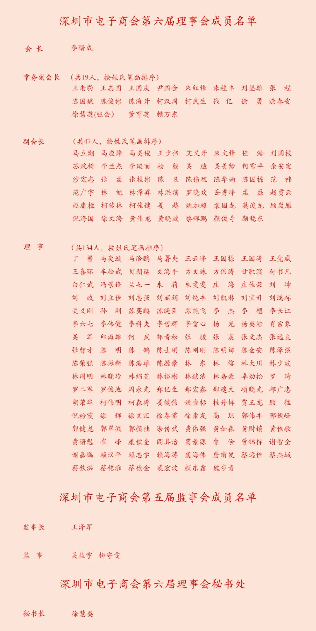 徐慧英秘书长受理事会聘请担任第六届理事会秘书处秘书长,会议还审议通过王老豹、王志国、王国庆、尹国会、朱红锋、朱桂丰、刘坚雄、张程、陈国斌、陈俊彬、陈海升、柯汉周、柯武生、钱亿、徐勇、涂春安、徐慧英(驻会)、董育英、赖万东(按姓氏笔画排序)共19人担任第六届理事会常务副会长。