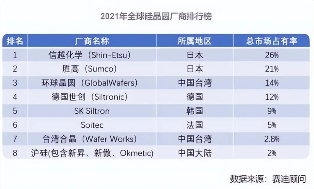 而日本企业是最牛的,信越化学和胜高(SUMCO)两大企业去年占了47%的份额,而今年据半导体行业国际团体SEMI预计,2022年,信越化学工业和SUMCO两家日本企业的全球份额占到大约6成。