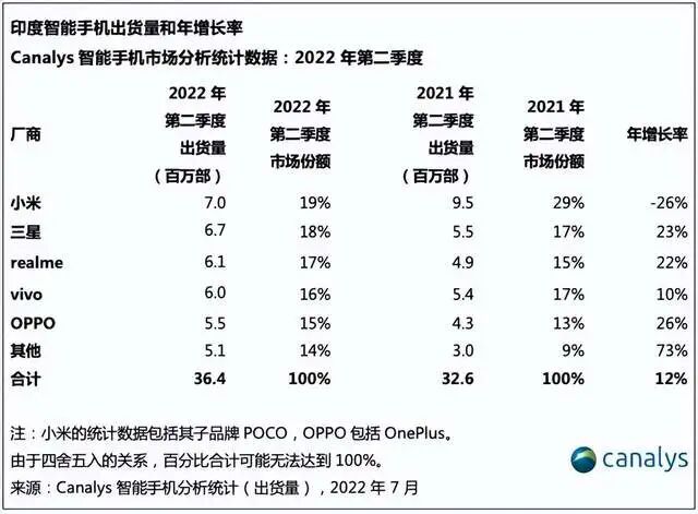 下图是2022年二季度,印度手机市场的排名情况,大家可以看到中国品牌已经拿下了前5名中的4个名次,4大品牌合计份额超过了67%。