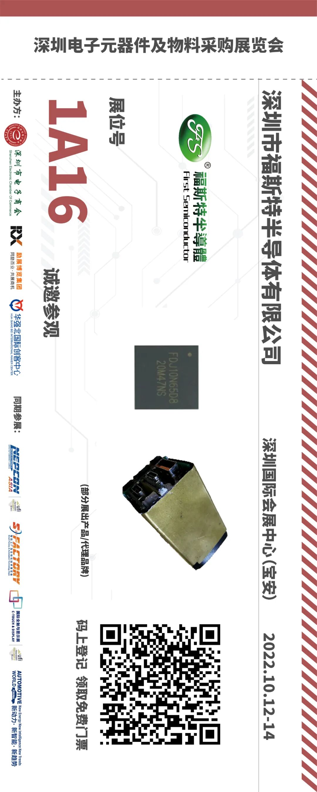 2022 深圳电子元器件及物料采购展览会,将于10月12-14日在深圳国际会展中心(宝安)闪亮登场,隆重开幕。深圳市福斯特半导体有限公司期待您的到来,展位号1A16,赶紧收下此邀请函,码上登记,我们不见不散!