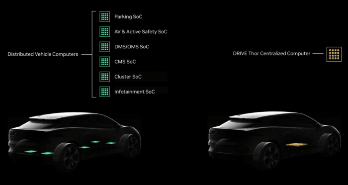但英伟达近日发布了一颗“Thor”(雷神)的芯片,这一颗是中央算力芯片,最大算力是2000TOPS!一颗芯片可以搞定自动驾驶、智能座舱、仪表盘等等算力,一颗能够取代汽车上原有的6颗。